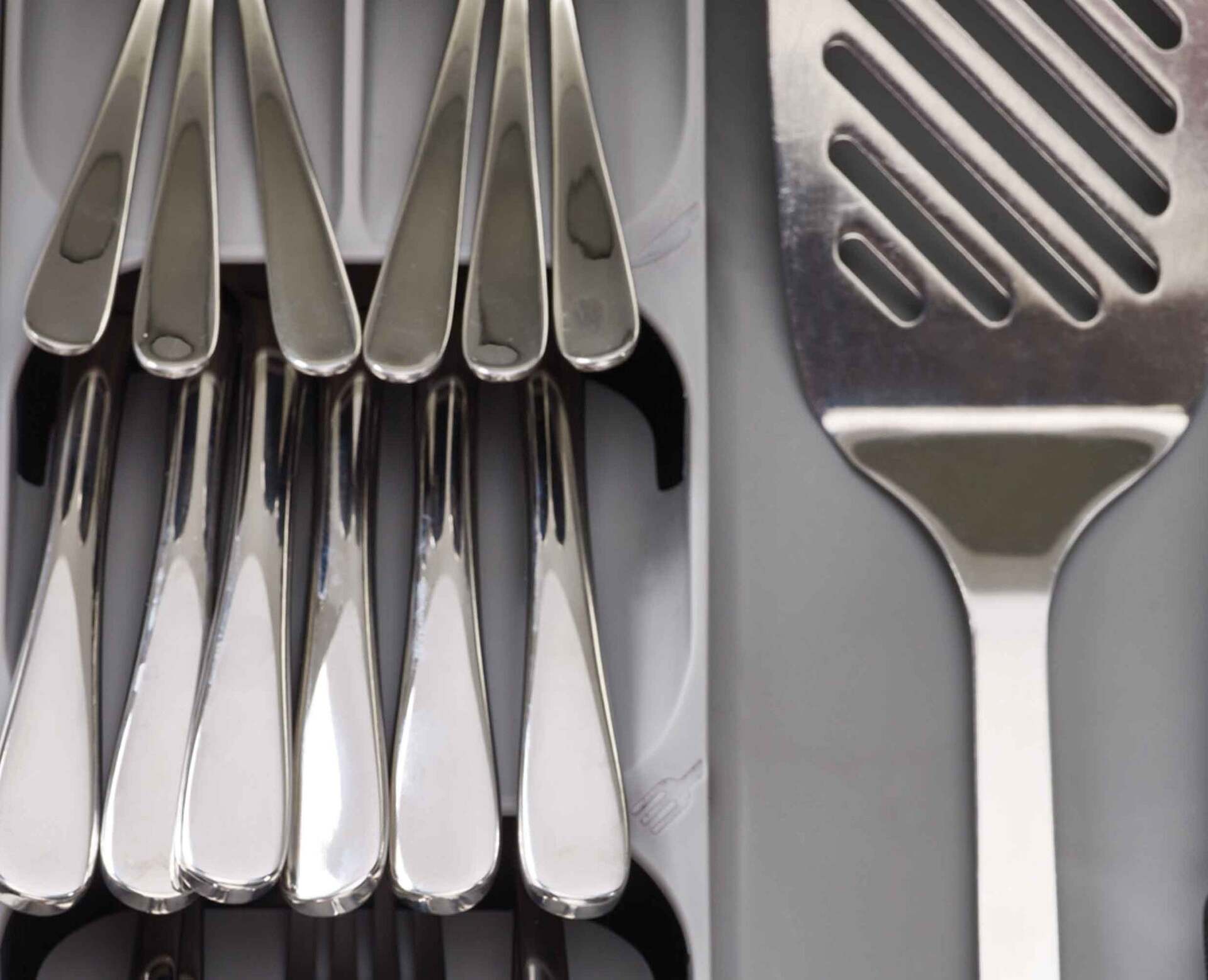 Uspořádejte si kuchyňskou zásuvku pomocí tohoto chytrého úložného řešení. Organizér má několik přihrádek, které slouží na ukládání příborů pod úhlem, což ušetří více než polovinu místa v zásuvce a dále prostory pro kuchyňské pomůcky nebo nože.