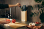 Táto súprava obsahuje 5 základných kuchynských nožov a úzky bambusový blok na ich bezpečné uloženie, ktorý zaberá menej miesta na pracovnej doske ako bežné bloky na nože.