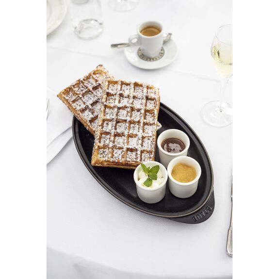 Podávajte čerstvé ryby priamo z rúry na stôl: V liatinovom tanieri Staub môžete napríklad upiecť chutnú rybu a potom ju servírovať priamo na stôl. Oválny, elegantný dizajn v čiernej farbe pritiahne všetku pozornosť na vaše rybie pokrmy. Servírovací tanier pojme až 0,7 litra a má atraktívny vzhľad vďaka výraznému mosadznému gombíku na veku. Pokrievka je navyše vybavená malými hrotmi, ktoré rozvádzajú vlhkosť, takže ryba zostáva počas varenia šťavnatá a jej chuť sa môže naplno rozvinúť. Rovnako ako ostatné kuchynské riady značky Staub, aj tento oválny servírovací tanier sa vyznačuje moderným poňatím klasického francúzskeho kuchynského dizajnu. Materiál je pevný a ľahko sa čistí, čo vám umožní ľahko pripraviť pokrmy a prezentovať ich v pravom štýle.