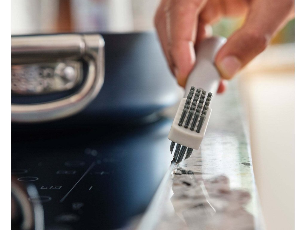 - Čisticí kartáček je vybaven štětinami ve tvaru písmene V pro čištění spár a špatně dostupných míst a integrovanou škrabkou