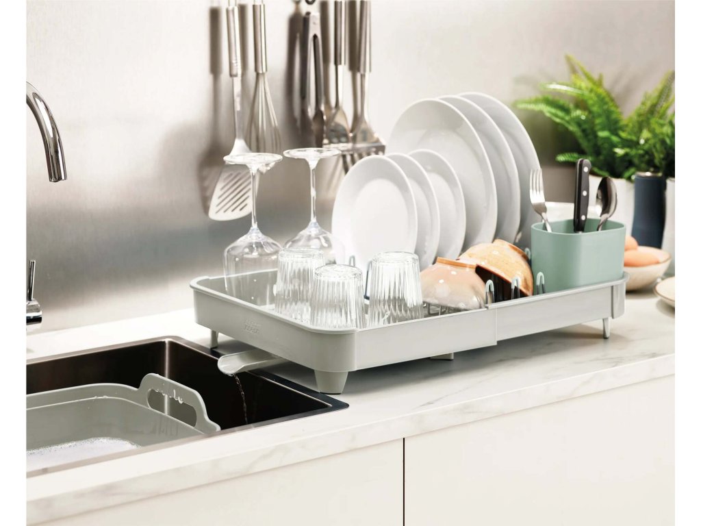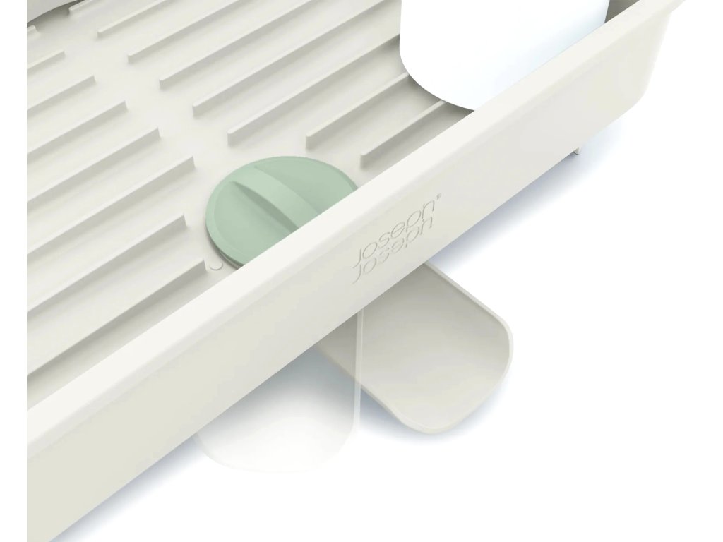 Rozšiřovatelný odkapávač na nádobí Joseph Joseph Extend umožňuje snadné zvětšení odkapávací plochy na téměř dvojnásobek. Součástí je samostatná přihrádka na příbory.