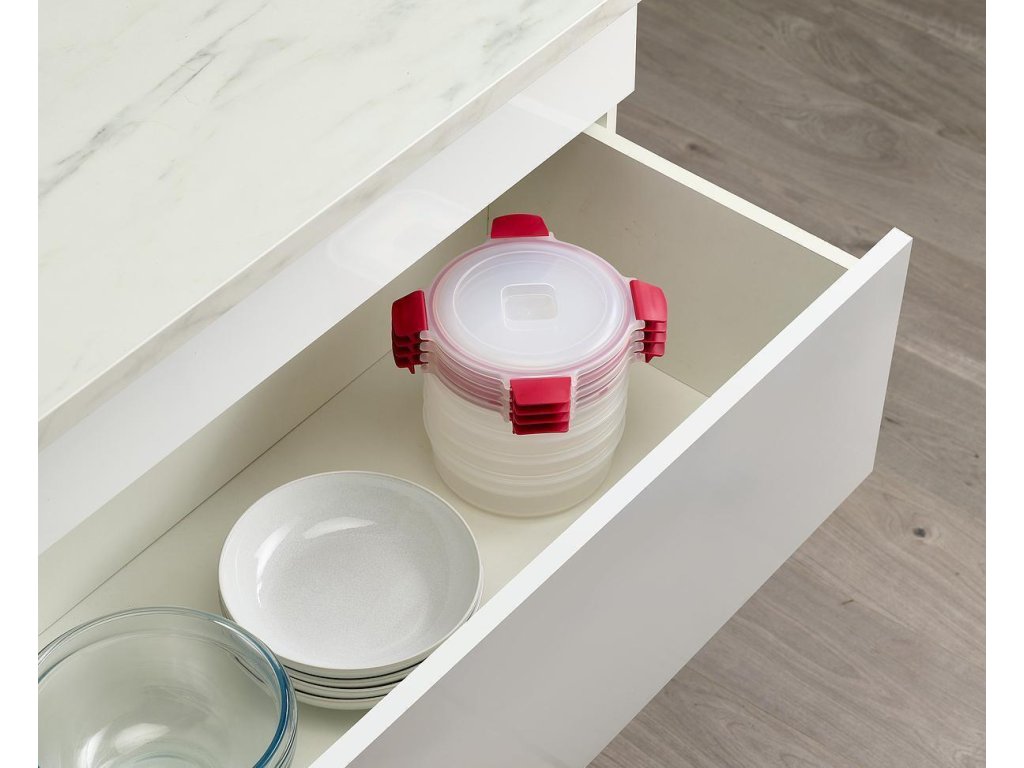 Tyto kulaté nádoby s uzamykatelnými víčky jsou navrženy pro snadné skladování potravin. Jsou stohovatelné, aby se daly jednoduše uspořádat na sebe a šetřily místem.