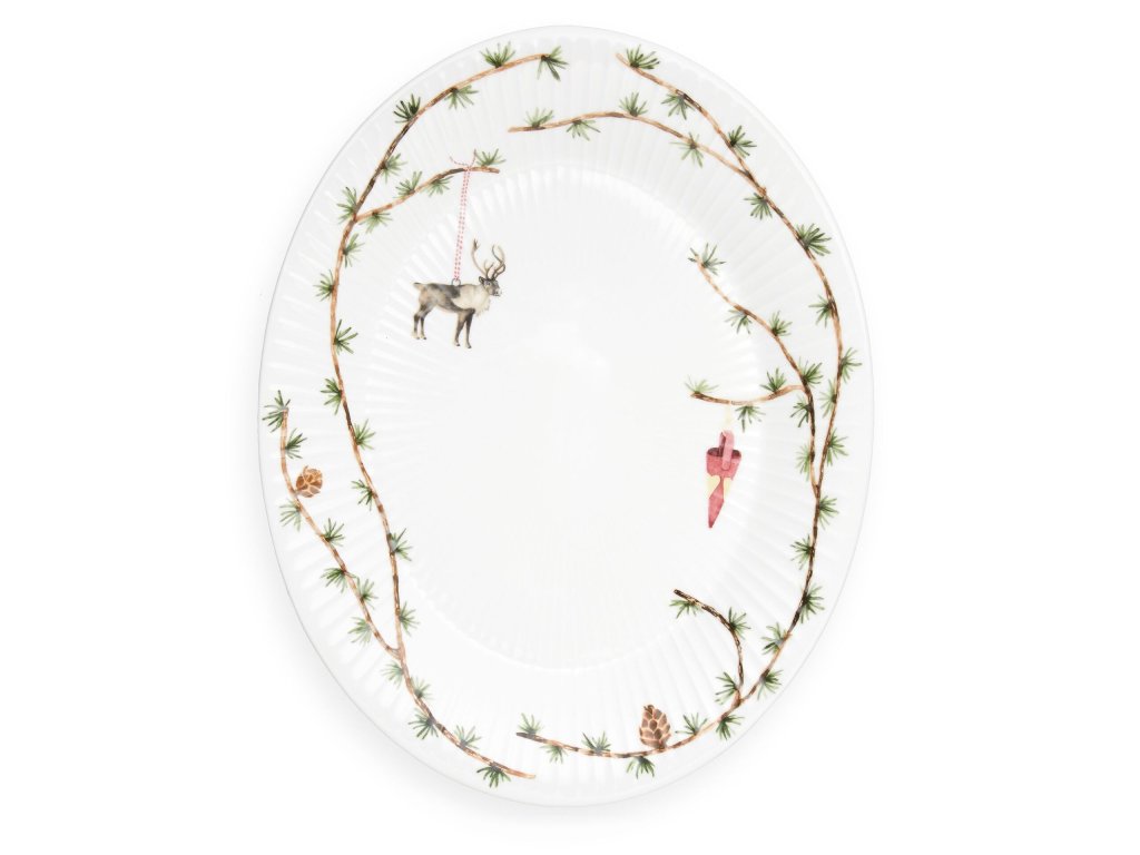 Hammershøi Christmas vítá Vánoce sérií jedinečných ilustrací na oblíbeném vánočním nádobí. Jemné, detailní vánoční motivy jsou dílem umělkyně Rikke Jacobsen. Ve svém charakteristickém stylu vypráví malé příběhy, v nichž se objevují například cukrové kornouty, andělé, vlašské ořechy, ptáci, šišky nebo hvězdy. Tento krásný servírovací talíř můžete použít při všech vánočních oslavách spolu s ladícími talíři ze stejné kolekce Hammershøi Christmas nebo v kombinaci s klasickými bílými talíři Hammershøi. Oválný talíř je k dispozici také v menší verzi 28,5 x 22,5 cm.