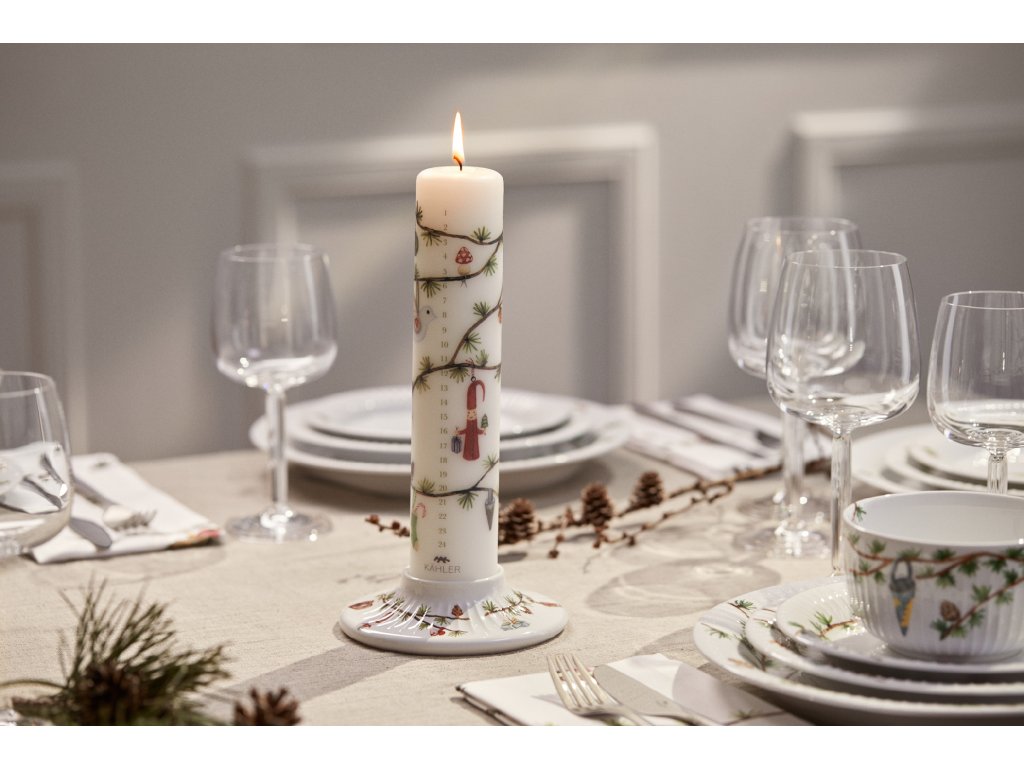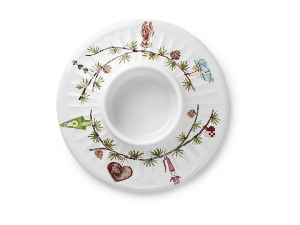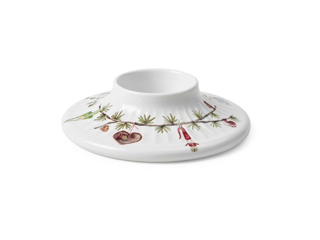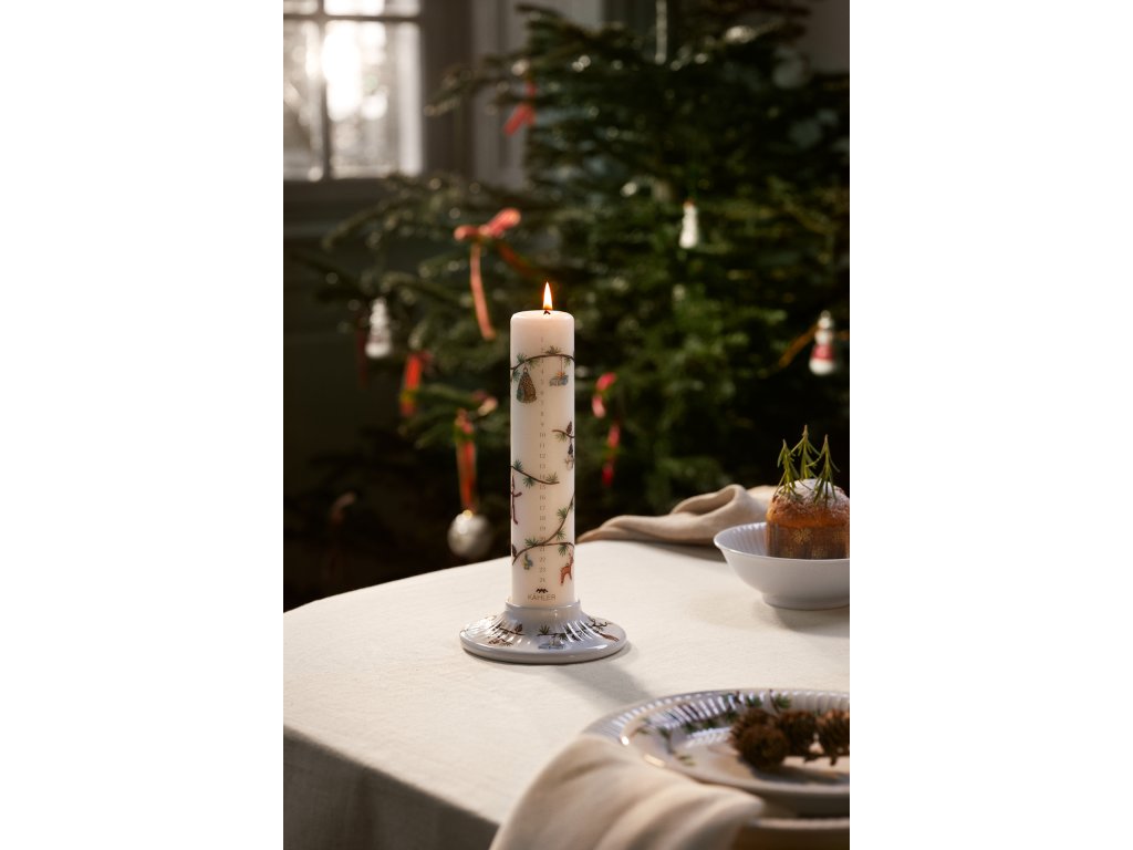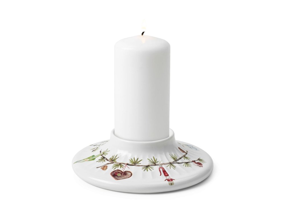 V souladu s ostatními doplňky této vánoční kolekce je svícen o průměru 13 cm zdoben malými nostalgickými vánočními motivy, jako jsou perníkové srdce, krásný vánoční dárek, skřítek, zelené srdce, malý medvídek, šiška, pletené dánské vánoční srdce a zelený cukrový kornout, vše spojené ikonickou modřínovou větvičkou.
