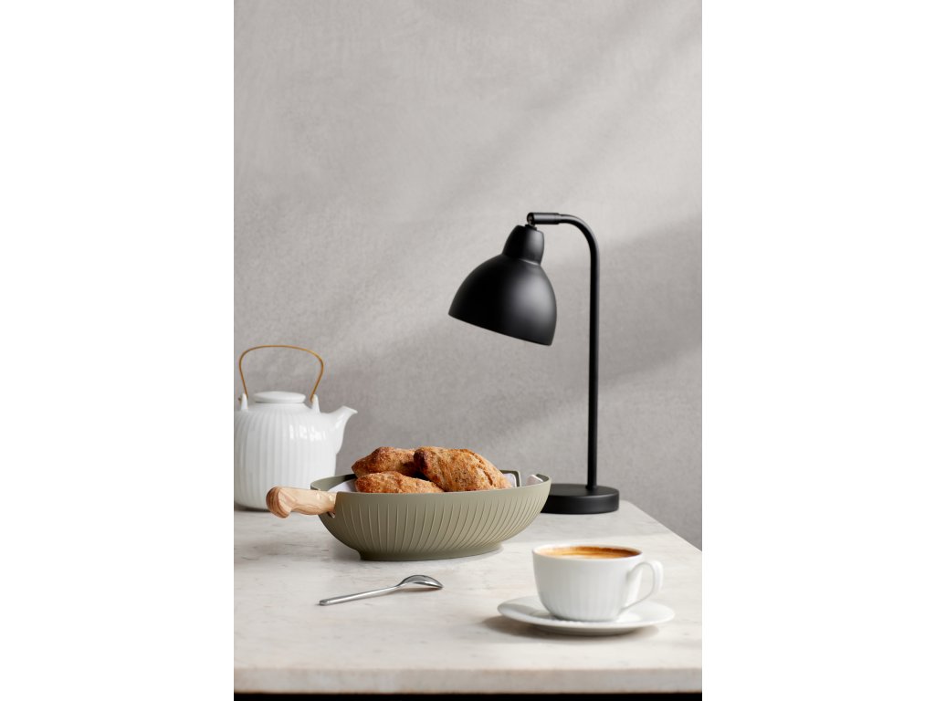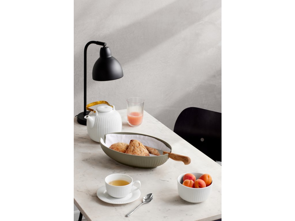 Elegantní košík na chléb a pečivo z kolekce Hammershøi od dánské značky Kähler je vyroben z olivově zeleného bio plastu v matné povrchové úpravě. Funkční otvory na stranách mísy slouží pro ukládání nože na chleba, takže jej máte vždy po ruce, když potřebujete nakrájet čerstvé bagety, housky a jiné oblíbené pečivo. Bílý látkový ubrousek, který je součástí, pomáhá prezentovat pečivo lákavě a charakteristické vroubky na vnější straně mísy krásně ladí s ostatním nádobím z kolekce Hammershøi. Košík na pečivo vytvořil Hans-Christian Bauer, který celou kolekci Hammershøi navrhl s velkým respektem k uměleckému kulturnímu dědictví, historii designu a tradici řemeslného zpracování značky Kähler.