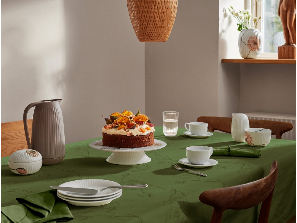 Máky z oblíbené kolekce nádobí Hammershøi Poppy od značky Kähler rozkvétají také na látkových ubrouscích v tlumené olivově zelené barvě. Výsledkem je krásný doplňek jak pro klasické bílé nádobí Hammershøi, tak samozřejmě i pro nádobí z kolekce Hammershøi Poppy. Zelené ubrousky Hammershøi Poppy jsou poetickou a moderní interpretací vlastního uměleckého díla přírody a dodají vašemu stolování krásnou květinovou estetiku a nadčasovou eleganci. Zelená barva vytváří hřejivý a důvěrný pocit bezpečí a krásně propojuje řadu Hammershøi Poppy s okolní přírodou.