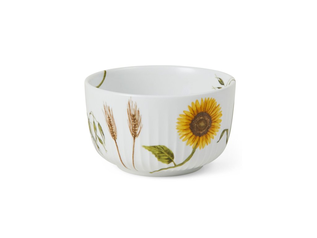 Porcelánová miska o průměru 12 cm je ideální pro servírování lesních plodů, sušenek nebo jiných pochoutek vašim hostům. Zdobí ji vysoká slunečnice a vlaštovka v letu. Slunečnice je po celém obvodu misky zvěčněna různými způsoby, což vám umožní vnímat pohyb, kterým během dne prochází: otevřený květ stojí od časného rána směrem ke slunci a během dne se pohybuje, aby zachytil co nejvíce slunečních paprsků. Na konci dne se slunečnice otočí směrem k západu. V noci se pak zase obrátí k východu a trpělivě čeká na návrat prvních slunečních paprsků. Autorkou akvarelových ilustrací je umělkyně Rikke Jacobsen, která se při tvorbě inspirovala kouzelnými tvary, barvami a atmosférou dánského léta.