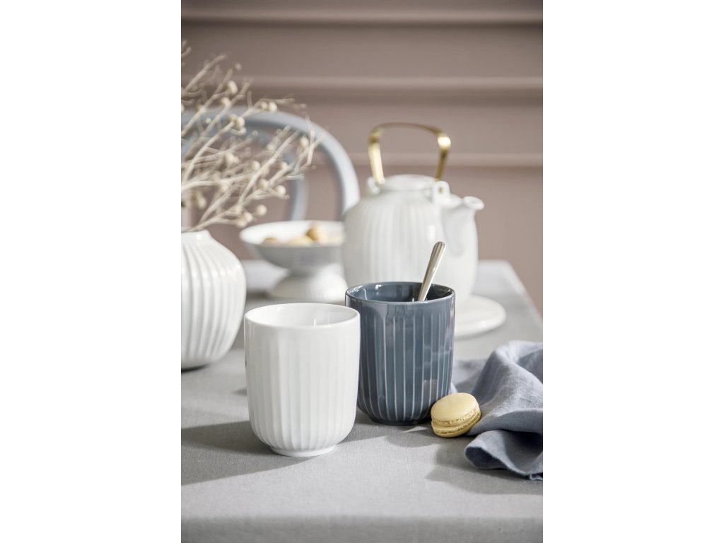 Doplňte svůj dokonalý čajový servis a podávejte kávu nebo čaj v těchto krásných velkých hrnečcích Hammershøi. Porcelánový hrnek v nadčasovém designu je zdobený jemnými vroubky, které jsou typické pro kolekci Hammershøi. Můžete ho použít pro horké i studené nápoje a je k dispozici v několika dalších barevných provedeních, které krásně doplňují ostatní nádobí značky Kähler.