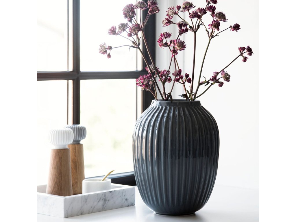 Charakteristické rýhy Hammershøi si již získaly místo v domovech mnoha milovníků severského designu. Rozšiřte svou kolekci Hammershøi o tuto jedinečnou vázu od Kähler. Váza má kolem hrdla malý lem, který spolu s drážkami a harmonickým stylem vázy dokáže prodloužit čerstvé květiny tak, že splynou s elegantní keramikou. Tuto velkou vázu můžete použít i jako jedinečný designový prvek.