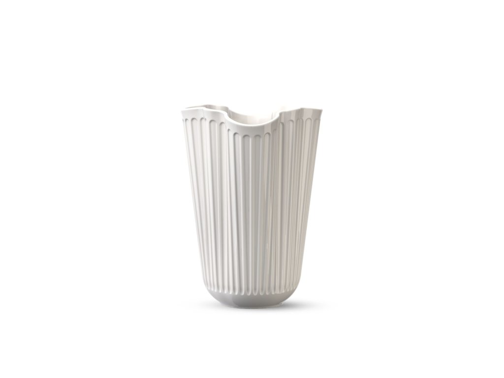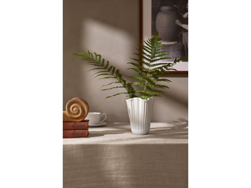 Vázy Hammershøi Unfold jsou vyrobeny z klasické matně bílé keramiky a dodávají se ve dvou velikostech. Tato menší váza je vysoká 16,5 cm a společně s větší variantou o výšce 20,5 cm tvoří dokonalý pár pro jarní a letní kytice i řezané větvičky. Obě vázy mají stejný jedinečný tvar, který této kolekci dodává nezaměnitelný moderní i nostalgický nádech. Spolu s ikonickými rýhami tak navazuje na hrdou tradici řemeslného umění značky Kähler.
