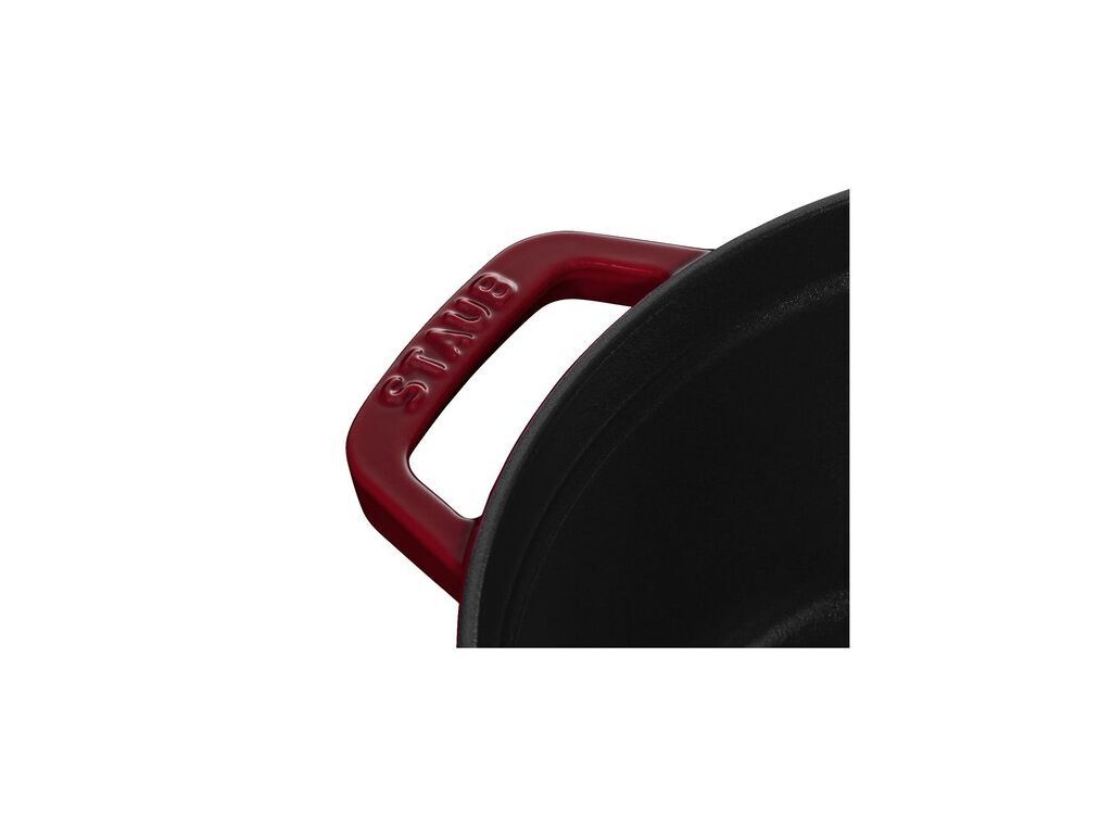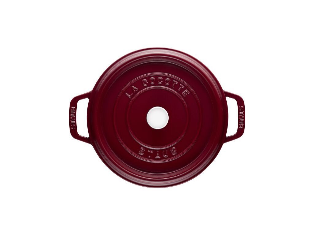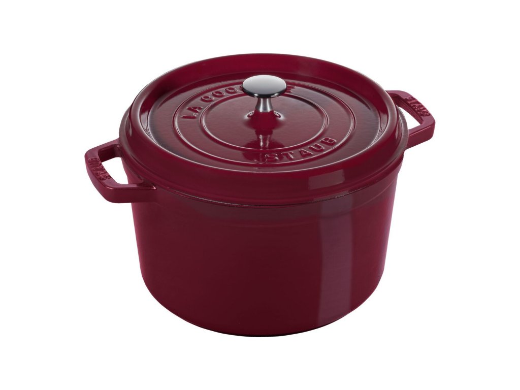Litinový hrnec Staub Cocotte v barvě bordeaux o průměru 24 cm je nyní dostupný ve variantě s okraji vyššími o 3 cm, díky čemuž má oproti klasické variantě objem o 1,0 l větší.