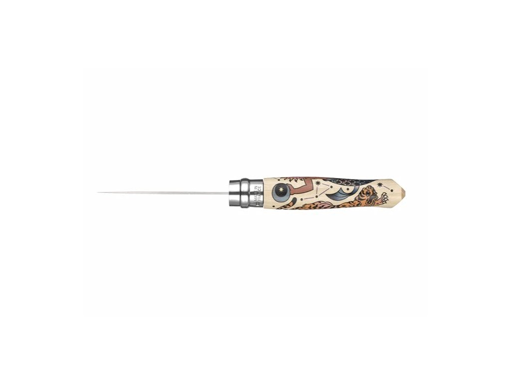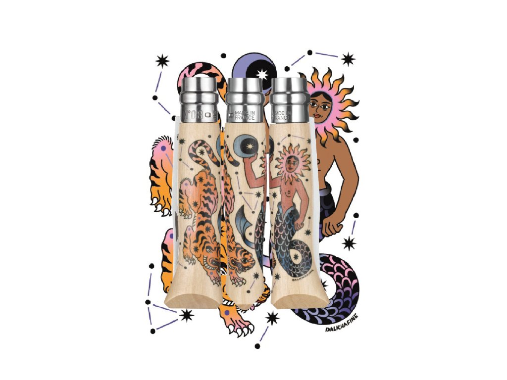 Tento kapesní nůž francouzské výroby má čepel z nerezové oceli o délce 8,5 cm a rukojeť z habrového dřeva s certifikátem PEFC, zdobenou kresbami za pomocí techniky sublimace. Je dodáván v krabičce s pohlednicí. Limitovaná edice 8 200 kusů, číslované čepele.