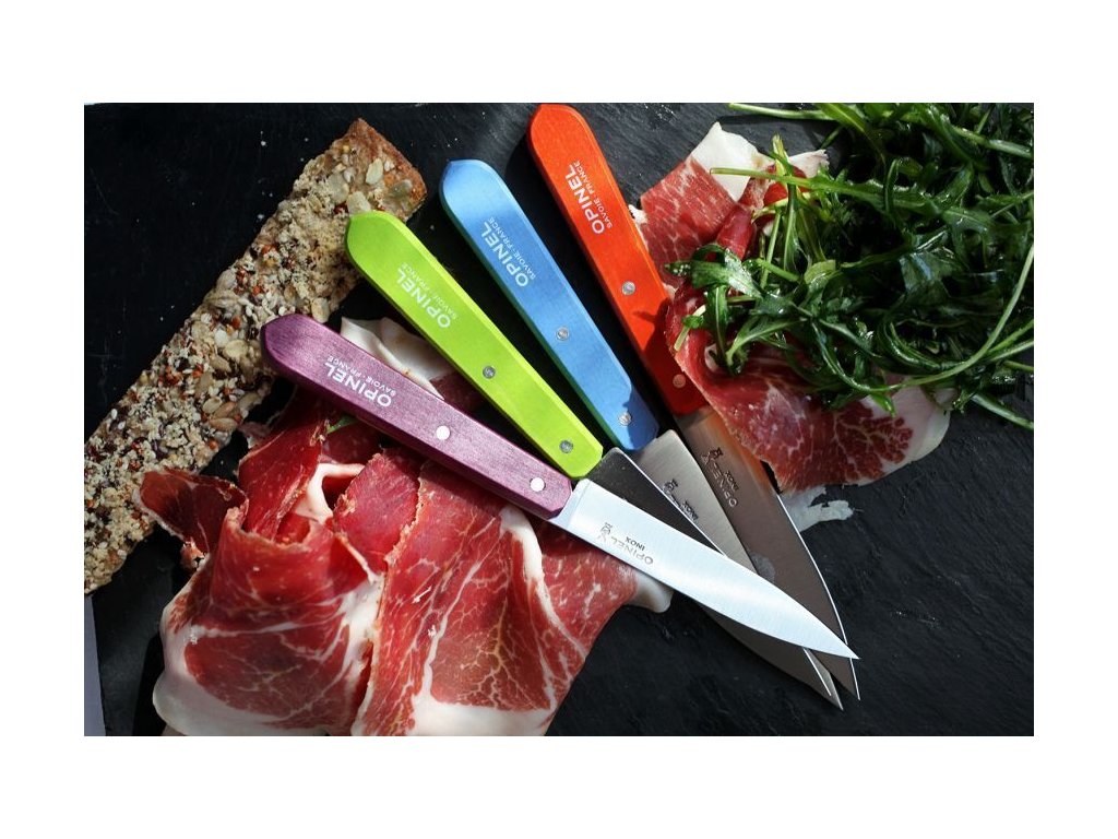 Sada nožů Opinel Les Essentiels Sweet-Pop Colours obsahuje 4 kuchyňské nože ve fialové, modré, oranžové a zelené barvě. Nože N°112 jsou univerzální, vhodné pro krájení zeleniny, ovoce a porcování menších kousků masa.