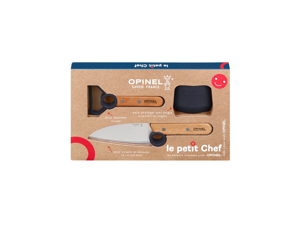 Stejně jako sdílíte recepty se známými, přesně tak fungují nože Opinel. S kolekcí Le Petit Chef posunete vaření s dětmi na úplně novou úroveň a to nejen díky důmyslné ochraně prstů, která ponechá klidné vás, ale dítěti dá pocit, že může zacházet s opravdovým nožem bezpečně a správnou metodou. 3 nástroje speciálně upravené tak, aby mohly být používané dětmi. Speciální kroužek pomáhá dětem udržet ruku v bezpečné vzdálenosti od ostří a předchází sklouznutí prstu při krájení. Zakulacená lakovaná buková rukojeť je velmi příjemná při držení a přesně pasuje do dětských rukou.