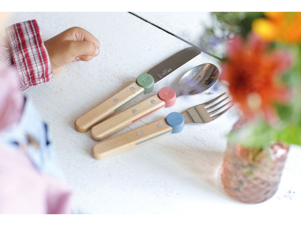 Sada příborů Le Petit Gourmet vybízí děti, aby se naučily jíst jako dospělí. Praktická a zábavná sada obsahuje nůž bez ostří, vidličku a lžíci v ideální velikosti pro dětské ruce. Tyto příbory vyrobené ve Francii kombinují rukojeť z bukového dřeva s certifikátem PEFC s prvky z nerezové oceli. Díky recyklovanému plastovému klipu je lze snadno spojit, uložit a přepravovat.