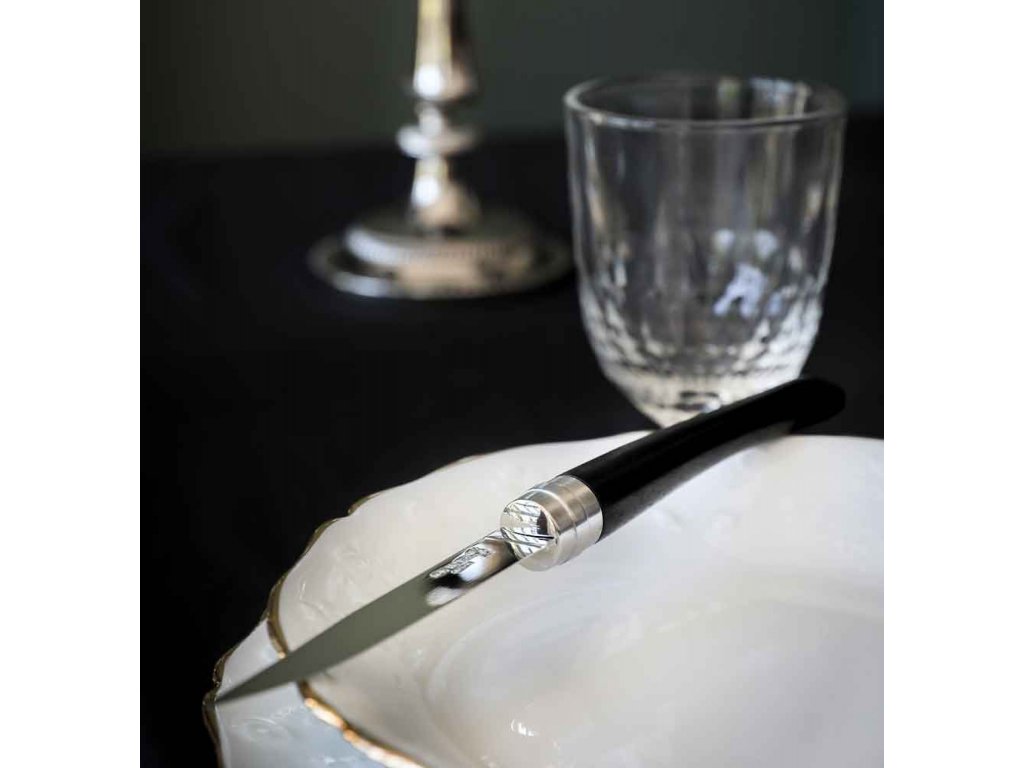 Sada stolních nožů z ebenového dřeva Table Chic obsahuje 4 elegantní nože, zabalené v kartonovém pouzdru, které ideálně poslouží i pro jejich skladování. Čepele z nerezové ocele Sandvick jsou vyleštěny do zrcadlového lesku. Ocelový kroužek na střence je opracovaný do plošky, která zajišťuje stabilitu nože na stole. Pevné, tmavě ebenové rukojeti se pohodlně drží.