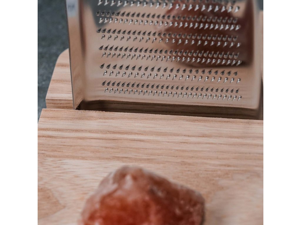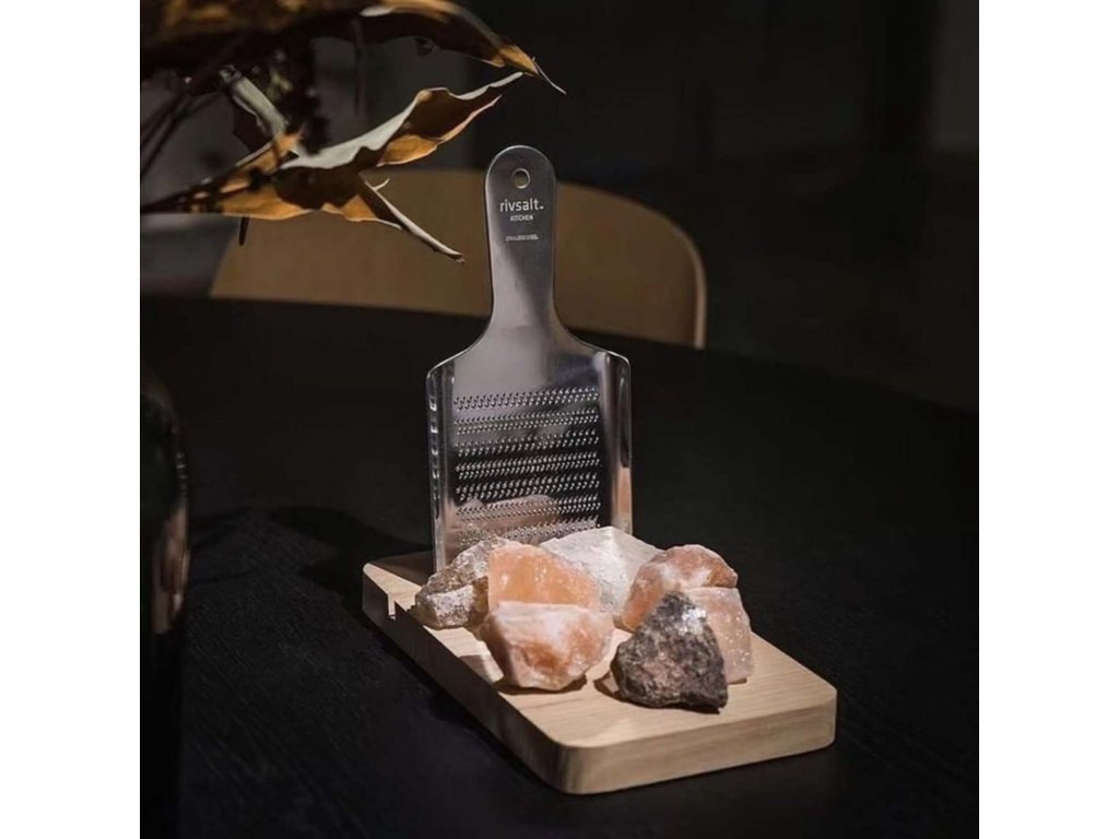 Rivsalt Kitechen přináší proslulý gastronomický zážitek do vaší kuchyně. S extra velkým struhadlem z nerezové oceli nastrouháte sůl z himálajských solných krystalů přímo do hrnců a pánví a na ryby a maso. Dobře tvarovaná deska z přírodního dubu slouží jako pevný podstavec pro struhadlo a krásně se na ni vejdou až čtyři další solné krystaly.