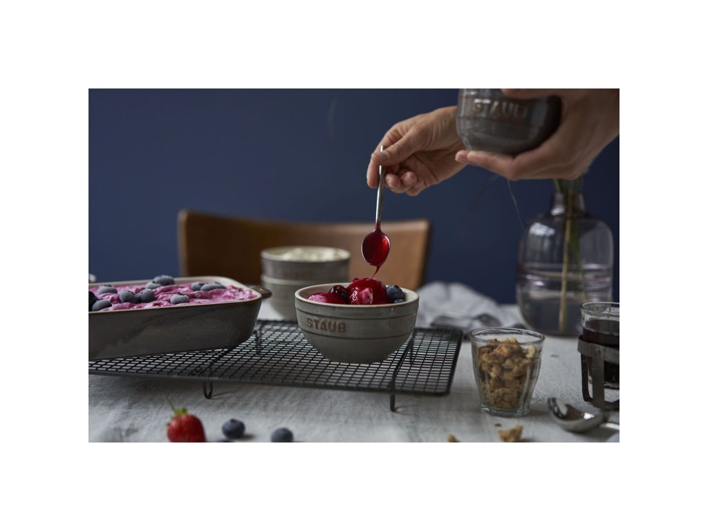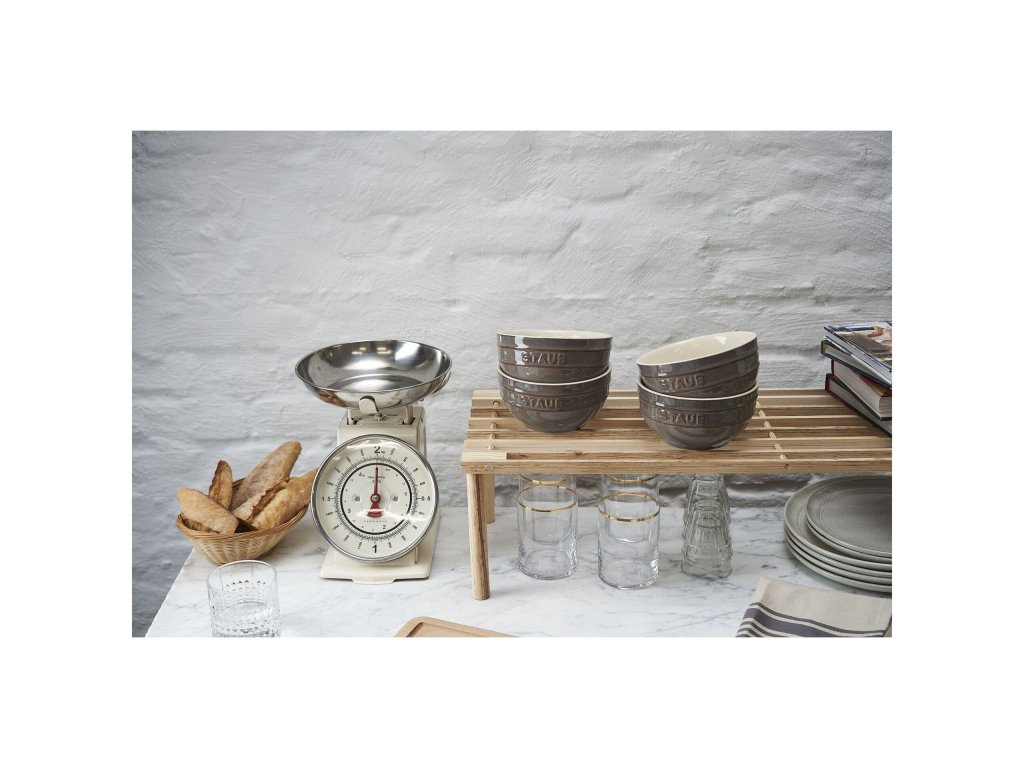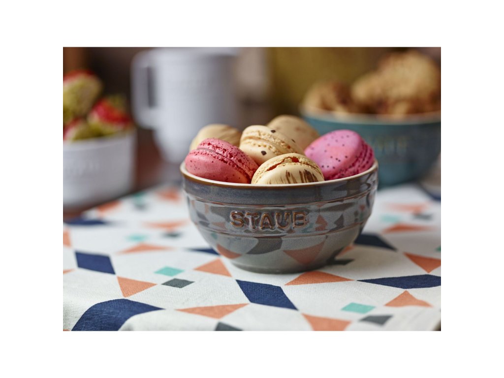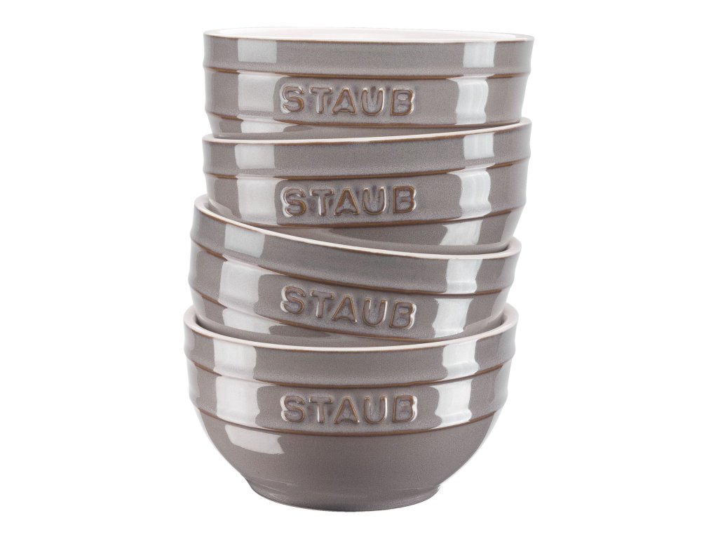 Odolné rustikální keramické misky o průměru 12 cm s výrazným reliéfním logem Staub jsou opatřeny silnou vrstvou glazury, jsou tedy odolné poškrábání a barevně stálé, snadno se myjí. Misky můžete používat i v mikrovlnné troubě a mýt v myčce nádobí.