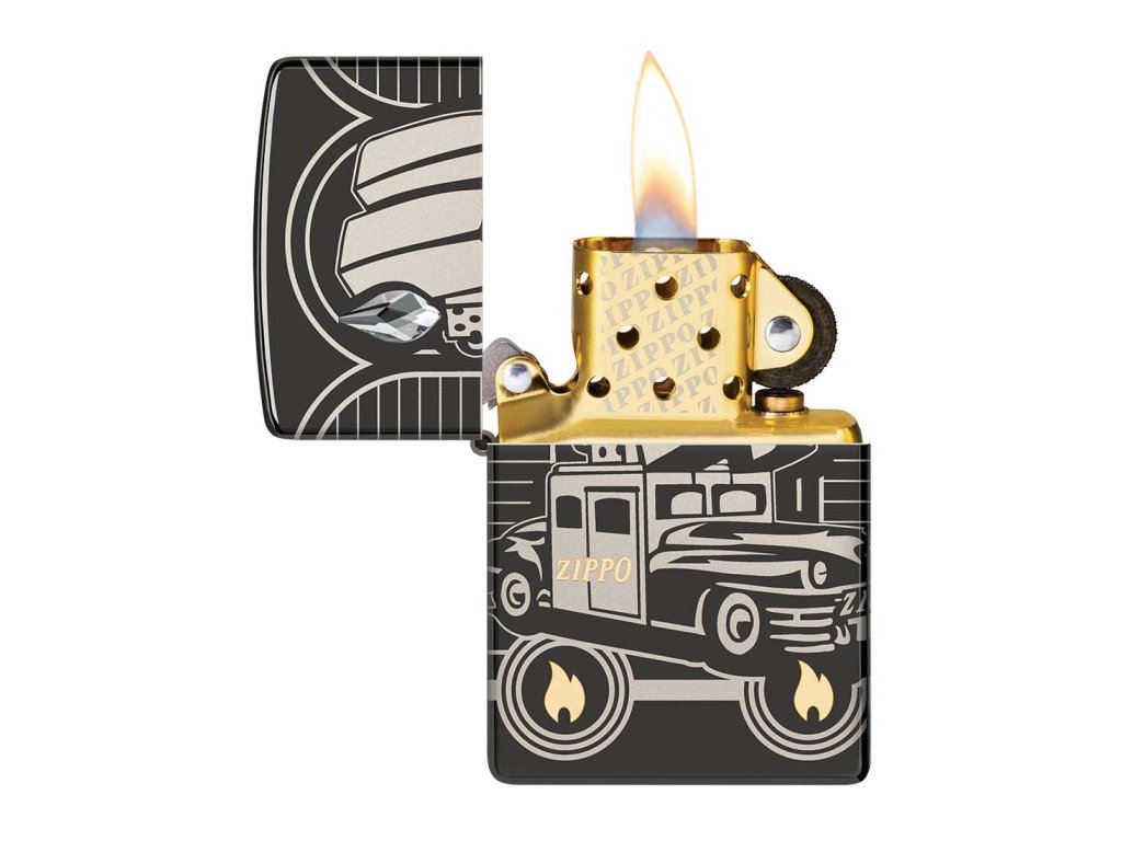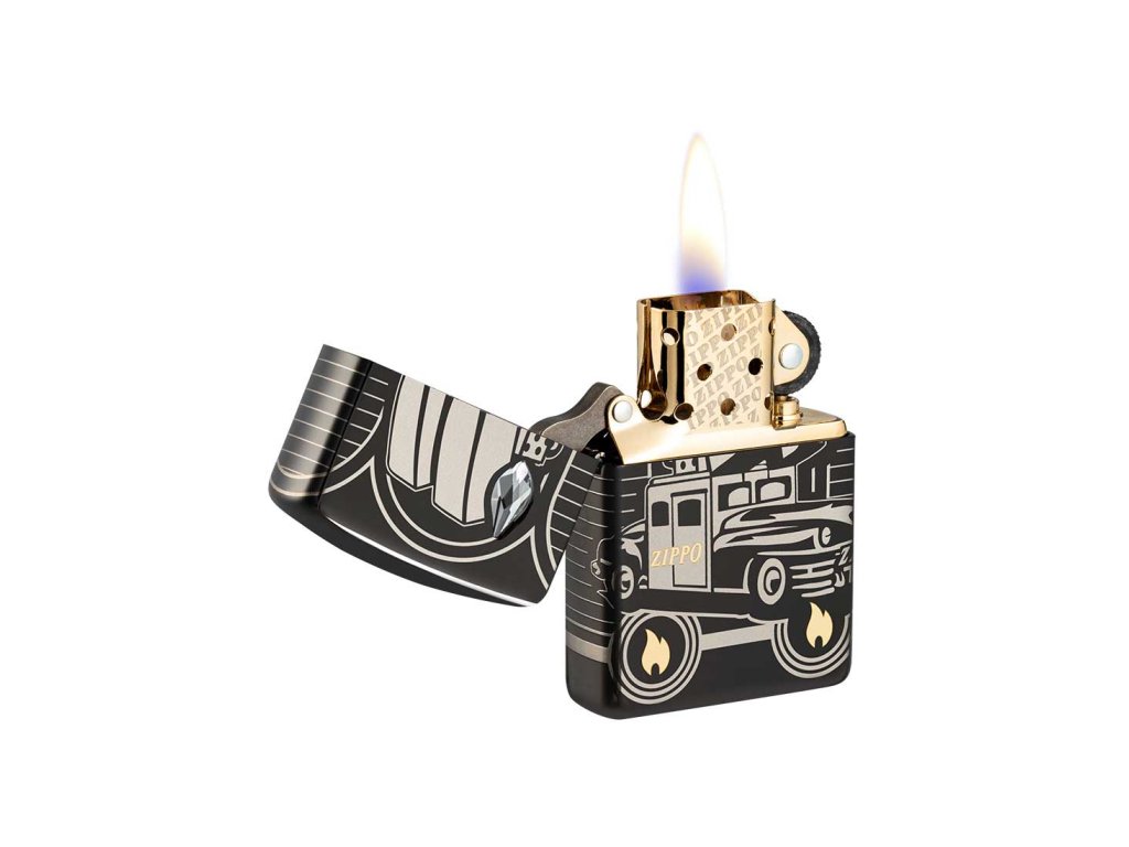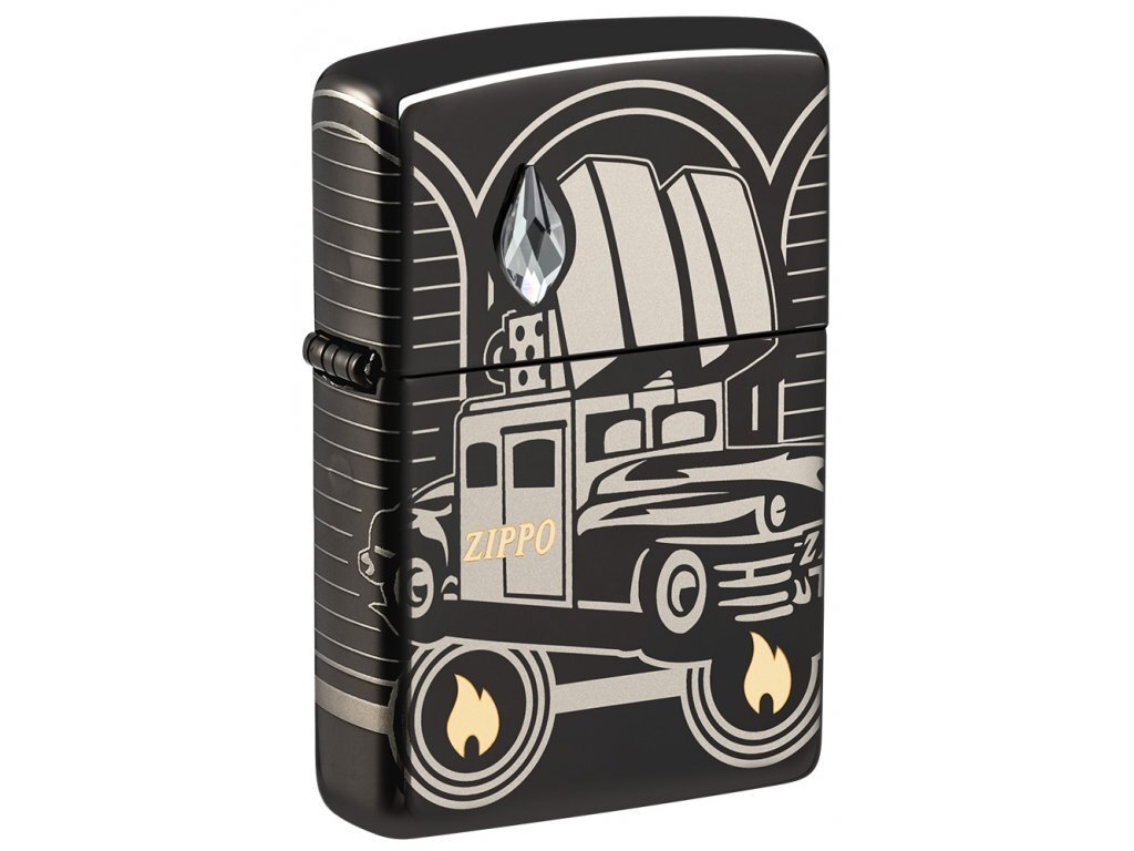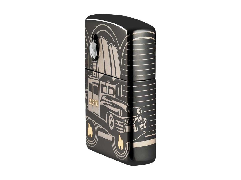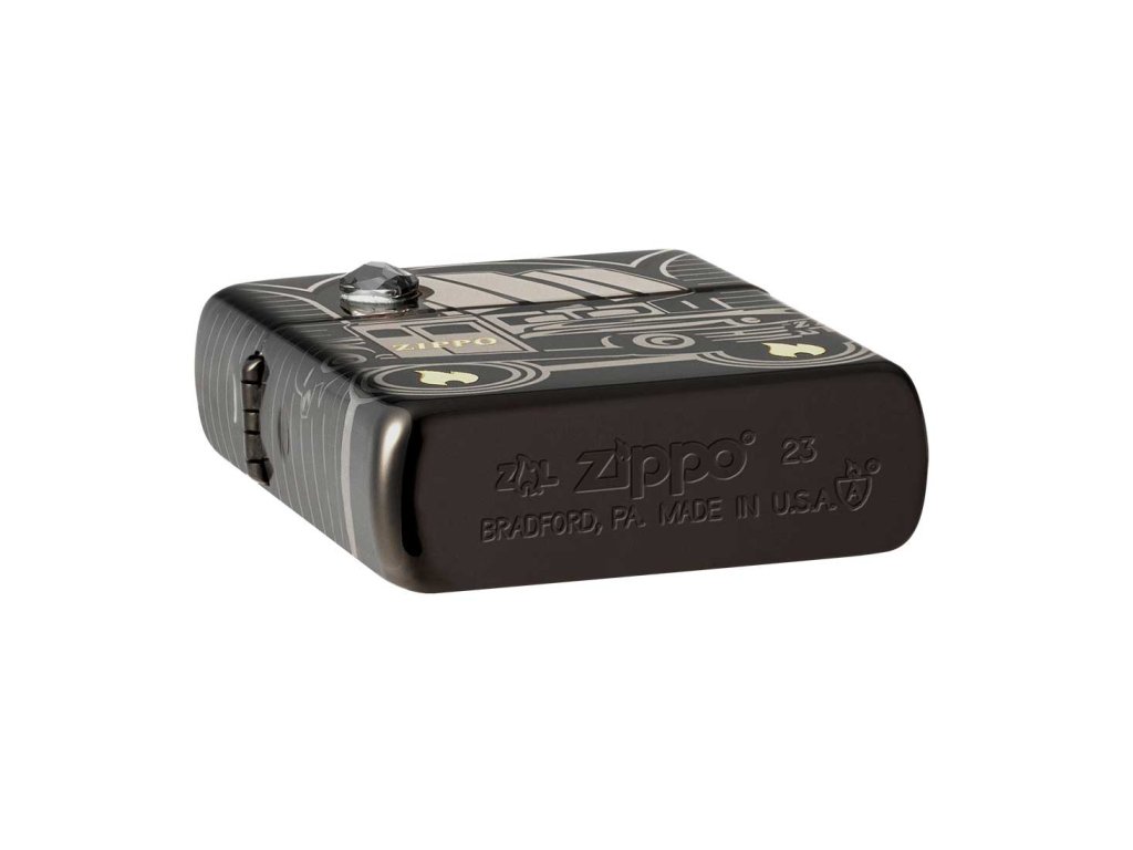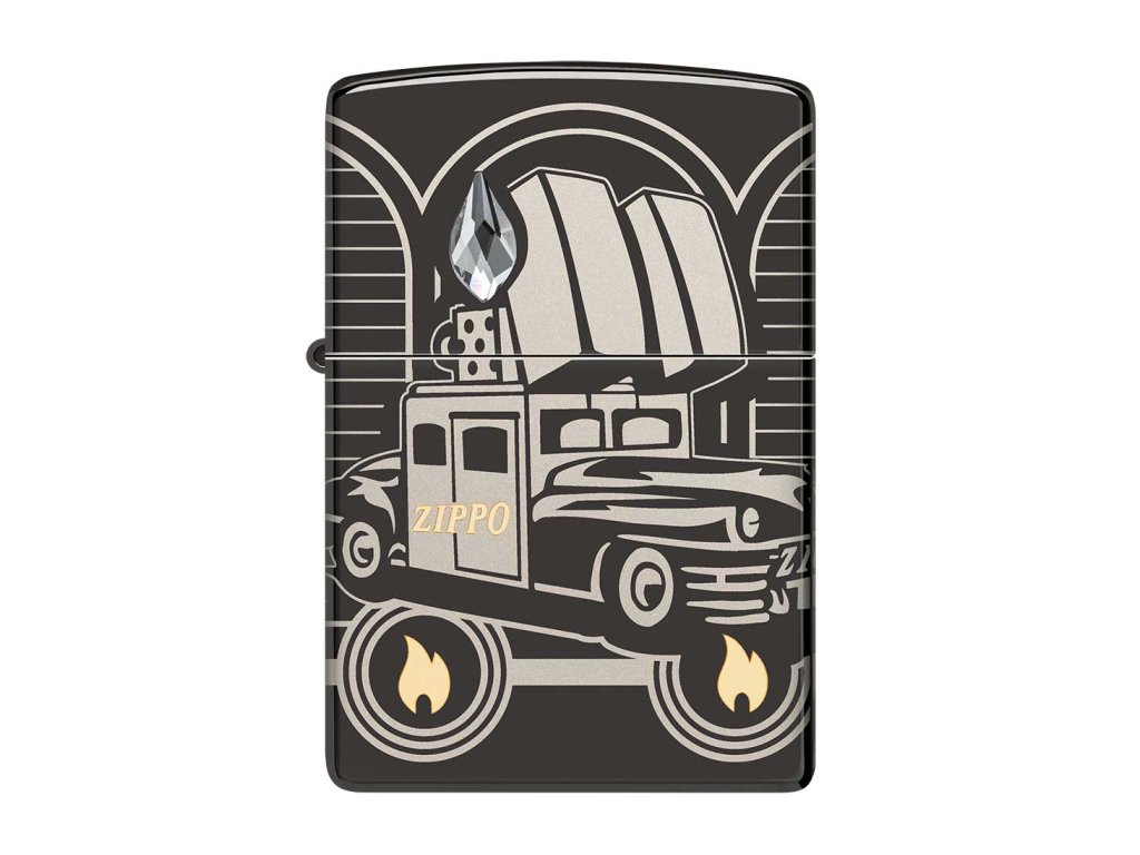 Tento sběratelský kus Armor® High Polish Black zobrazuje ikonický vůz Zippo v celé jeho kráse pomocí procesu Photo Image 360°, který přenáší motiv po všech stranách zapalovače. Pomocí technologie Laser Two-Tone je plamen Zippo a ikona 75. výročí odhalena v luxusních mosazných tónech, zatímco komín vozu je osvětlen třpytivým křišťálem, který byl vybrán speciálně pro evropskou edici.