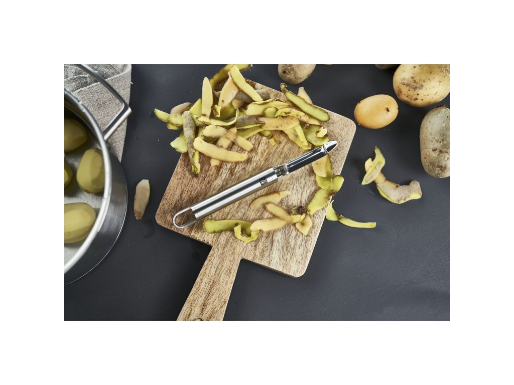 Robustní celonerezové provedení škrabky je přitažlivé na pohled, ale také funkční a pohodlné na použití. Saténově matná rukojeť byla navržena v souladu s ergonomií. Ostré břity od solingenského velmistra ve výrobě nožů Zwilling J. A. Hanckels si pak hravě poradí s loupáním. Výkyvná čepel se přizpůsobuje povrchu a tím práci ještě více usnadňuje. Použitá nerezová ocel 18/10 je hygienická, nepřebírá chutě ani pachy. Škrabku můžete mýt v myčce nádobí. Poutko na konci její rukojeti umožňuje zavěšení škrabky nad pracovní plochu.